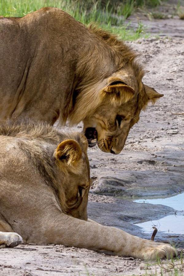 獅子被幼蛇嚇退,對峙敗下陣來。近日,英國一位攝影師在非洲博茨瓦納一處野生動物保護區(qū)捕捉到兩只獅子與小眼鏡蛇對峙的場景,據(jù)攝影師猜測,這兩只獅子大約兩歲,估計以前沒見過蛇,因此看到泥潭里的眼鏡蛇時很是好奇。