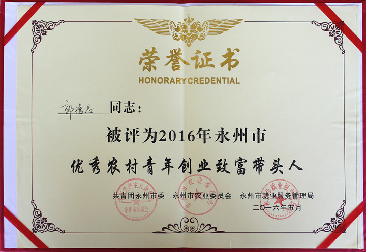 永州市優(yōu)秀農(nóng)村青年創(chuàng)業(yè)致富帶頭人榮譽(yù)證書(shū)